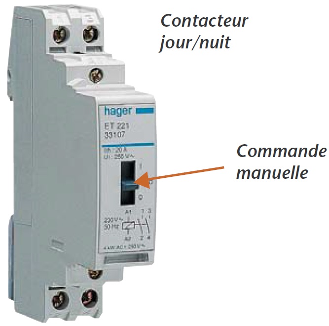 Un contacteur est une sorte d’interrupteur à déclenchement automatique. Il se compose d’un électroaimant qui, lorsqu’il est alimenté, ouvre l’électroaimant, parcourue d’un courant de faible intensité, s’appelle le circuit de commande. Le circuit permettant d’établir le contact est appelé circuit de puissance, car il permet le passage d’intensités plus élevées que le circuit de commande. Dès que l’élec troaimant est alimenté, le contact du circuit de puissance se ferme. Lorsque l’électroaimant n’est plus alimenté, le contact s’ouvre. Les contacteurs peuvent intégrer jusqu’à quatre contacts.Le contacteur jour/nuit fonctionne sur le même principe. À chaque changement de plage horaire, EDF ouvre ou ferme le contact électrique disponible sur le compteur électronique, un relais de découplage ou sur une horloge. Ce contact fait office d’interrupteur : il n’est pas sous tension. Il faut donc le relier en série avec le circuit de commande du contacteur jour/nuit et protéger l’ensemble par un disjoncteur divisionnaire de 2 A. En outre, le contacteur jour/nuit dispose d’un dispositif de commande manuelle qui permet une relance de la chauffe pendant les heures pleines ou l’arrêt total pendant les absences prolongées.